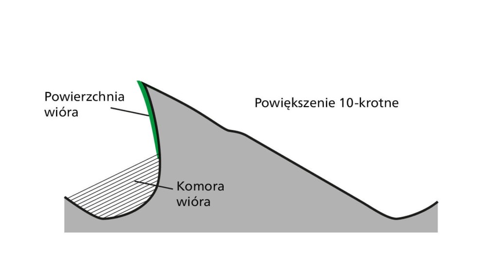 Ząbki nie są wykuwane, lecz frezowane z jednej całości. Dziesięciokrotne powiększenie pokazuje: Każdy ząbek jest ukształtowany w taki sposób, że wióry zawijają się przed zaokrągloną powierzchnią natarcia i trafiają do komory na wióry.