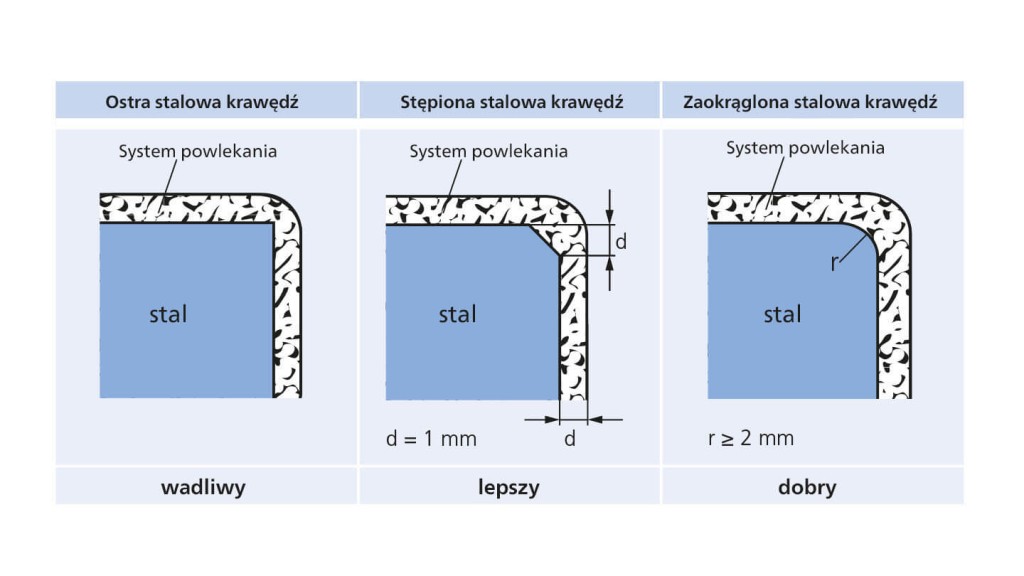 Powłoki na ostrych krawędziach mają mniejszą grubość niż na płaskich powierzchniach. Warstwy ochronne częściej się łuszczą i można je łatwiej uszkodzić.